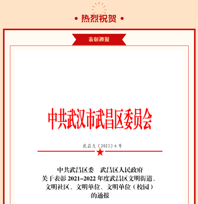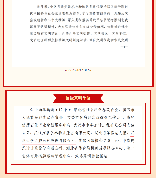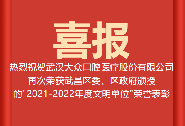 武漢大眾口腔醫(yī)療股份有限公司喜獲武漢市武昌區(qū)“2021—2022 年度區(qū)級文明單位”榮譽(yù)稱號,這既是黨和政府對公司長期以來堅持將企業(yè)文化建設(shè)和精神文明建設(shè)緊密結(jié)合發(fā)展理念的充分肯定,也為公司未來精神文明建設(shè)跨上新的臺階注入了巨大動力,奠定了堅實的基礎(chǔ)。