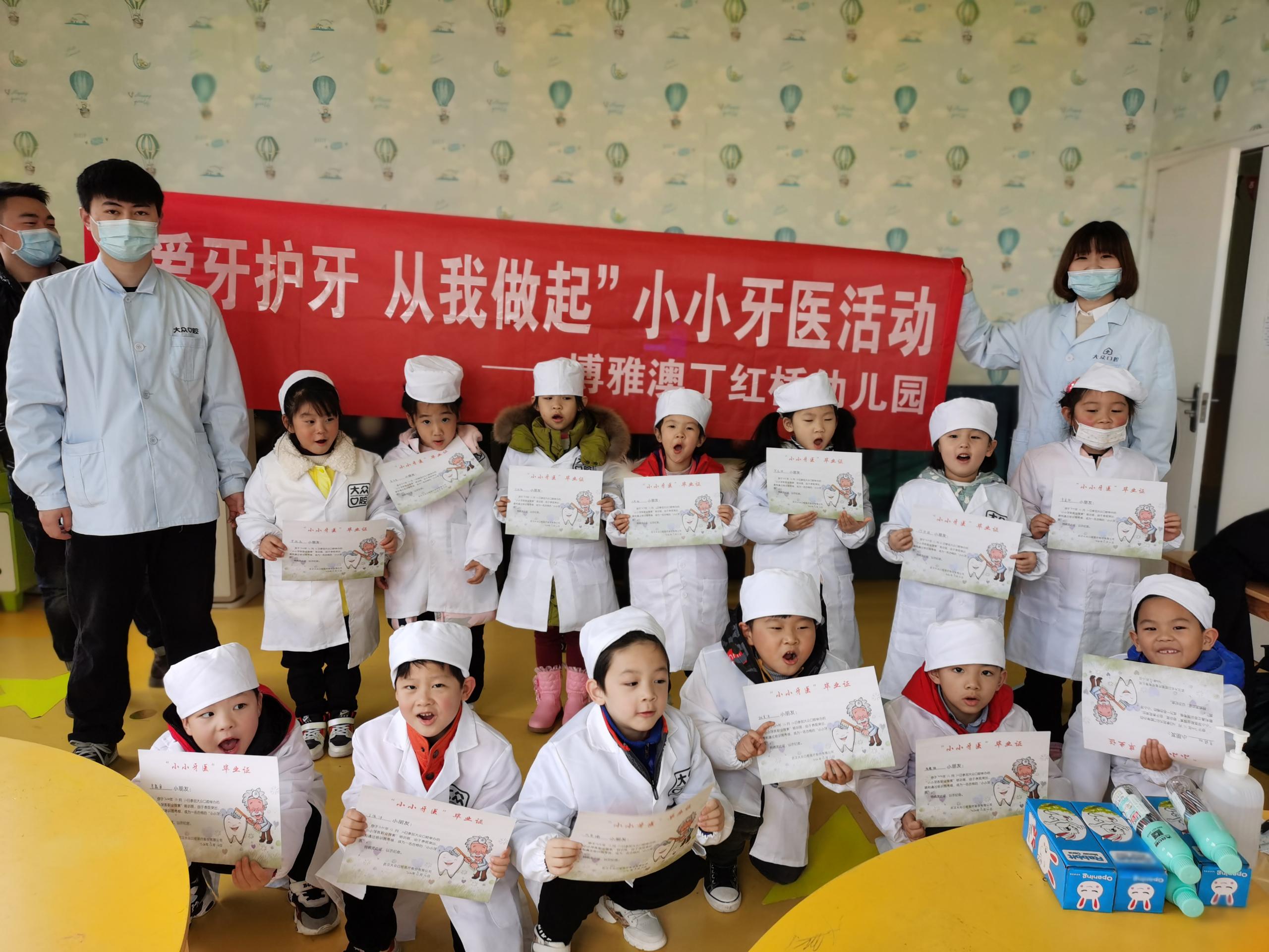 幼兒期是保護(hù)牙齒的重要時(shí)期,從小養(yǎng)成愛護(hù)牙齒的好習(xí)慣對(duì)孩子的健康有著非常重要的意義。12月10日,愛尚大眾口腔攜手博雅澳丁紅橋幼兒園和薛峰幼兒園,開展了小小牙醫(yī)親子職業(yè)體驗(yàn)活動(dòng),讓孩子們體驗(yàn)當(dāng)小小牙醫(yī)的工作,在玩樂(lè)中學(xué)習(xí)全面的口腔知識(shí),從此不再懼怕看牙!