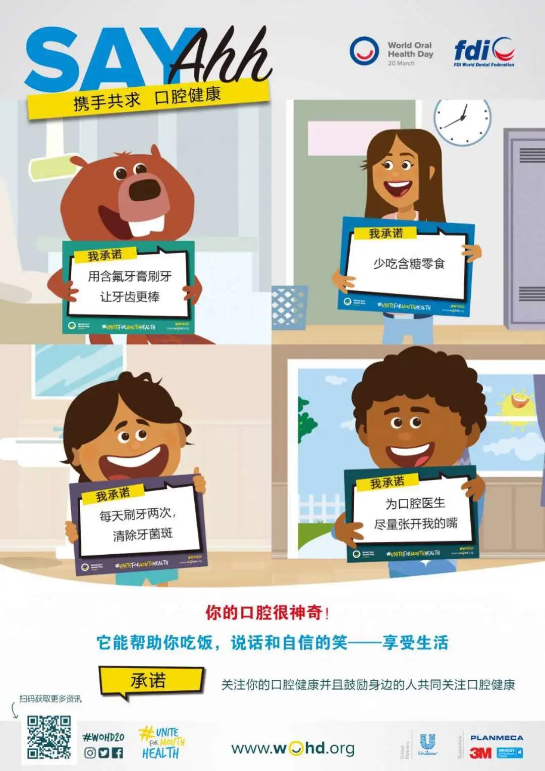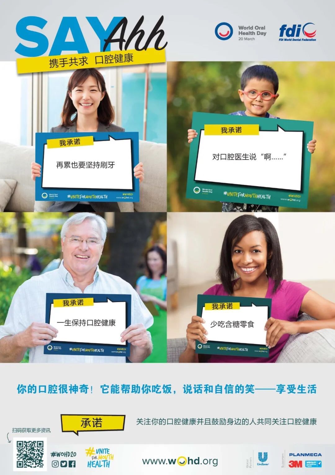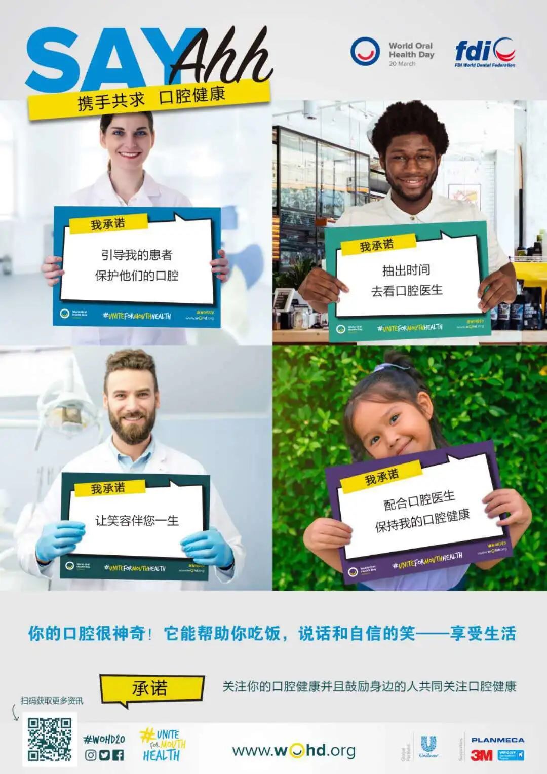 今年世界口腔健康日活動(dòng)官方主題為“Say Ahh:攜手共求 口腔健康”,呼吁人們重視并行動(dòng)起來,關(guān)注口腔健康,維護(hù)全身健康。