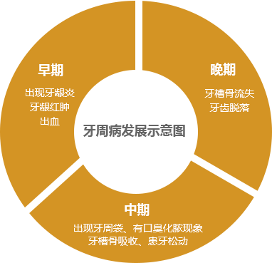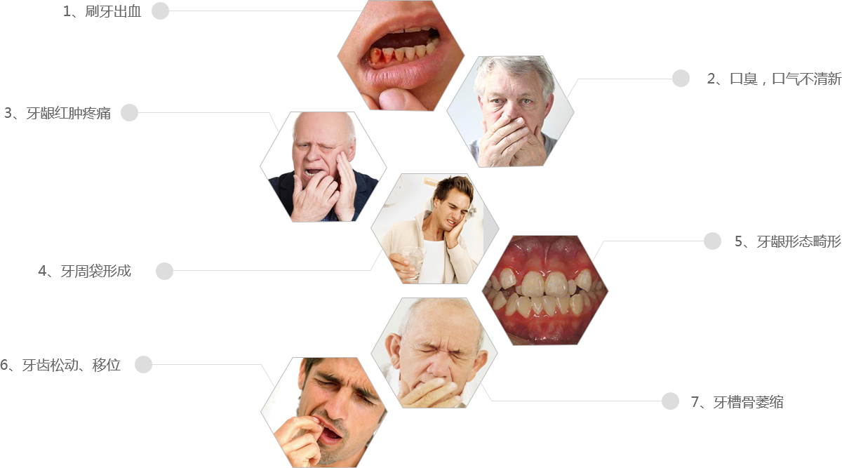 患牙周疾病后,輕者牙齦發(fā)炎、出血、疼痛、口臭,重者牙周組織被破壞,使牙齒與牙齦分離,導致牙齒松動移位、牙齒酸軟、咀嚼無力、甚至脫落,而且還會引發(fā)許多疾病,如風濕、抑郁癥、心臟病、血液病等等