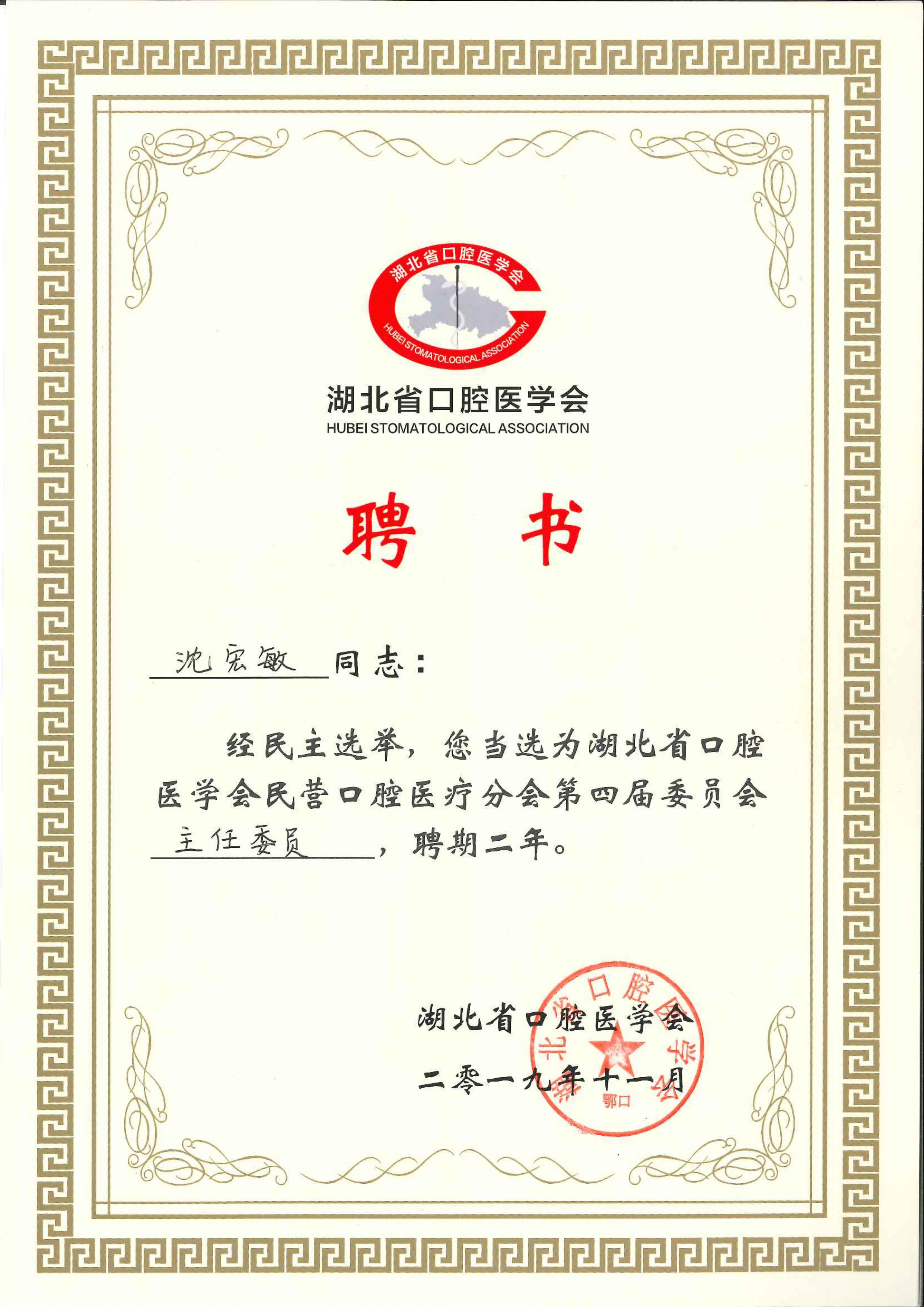 2019年—愛尚大眾口腔總經(jīng)理沈宏敏當選湖北省口腔醫(yī)學會民營口腔醫(yī)療分會第四屆專委會主任委員